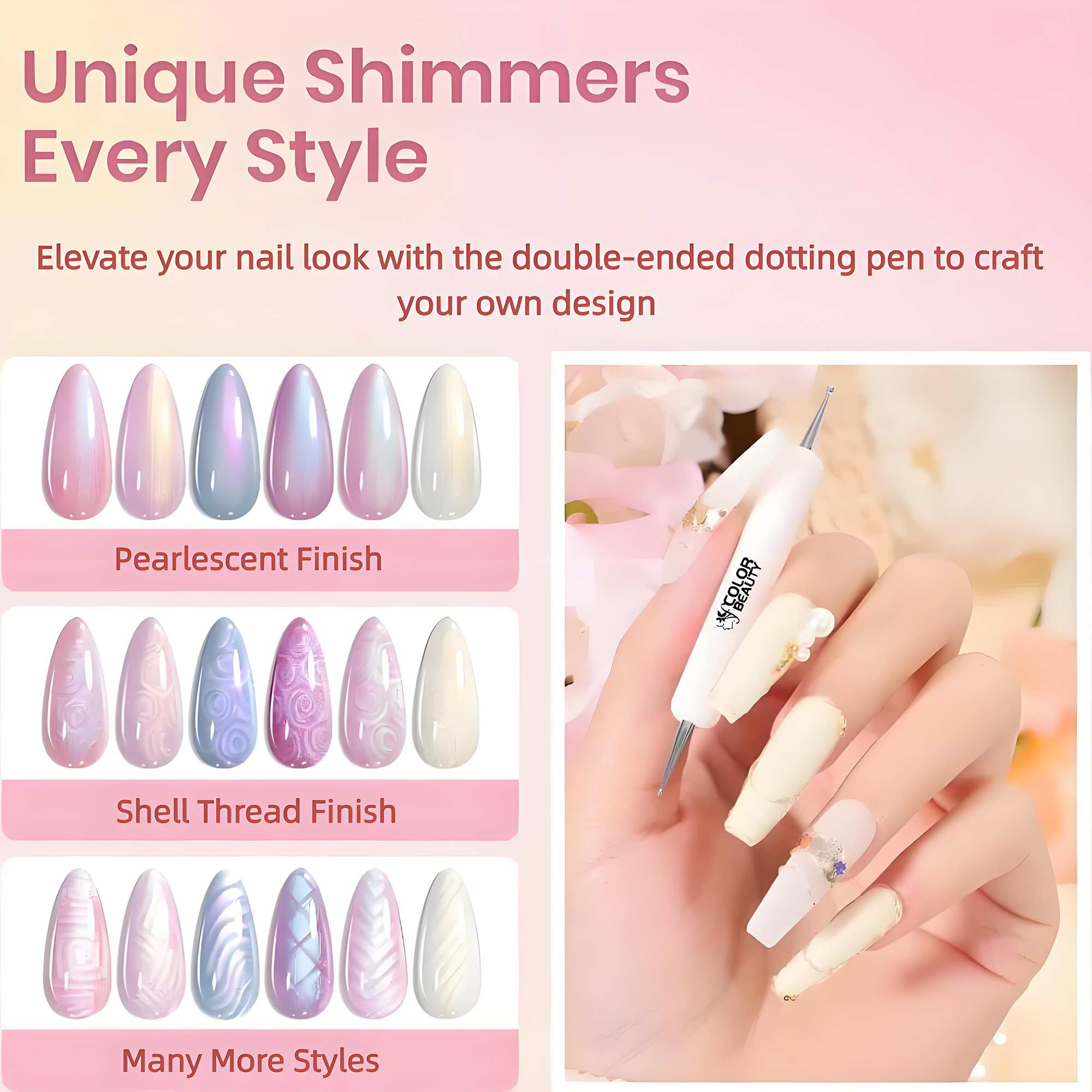 个人风格:涵盖白、蓝、粉、紫等多款极光珠光色调!梦幻闪耀,提升美甲质感,满足任何季节和场合的搭配需求。提供省心贴心的客户服务